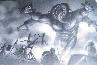"Nós achamos o corpo de nosso guia transformado em uma polpa sangrenta e coberto com um tipo de gosma pegajosa. Só descobrimos que era ele pelos objetos pessoais largados ali perto. Era como se uma lesma colossal tivesse rastejado por cima dele, esmagando seu corpo até se tornar um rastro vermelho que se estendia por quase 5 mestros. O pouco que restou havia sido achatado e dilacerado, cada osso de seu corpo pulverizado por um peso avassalador".