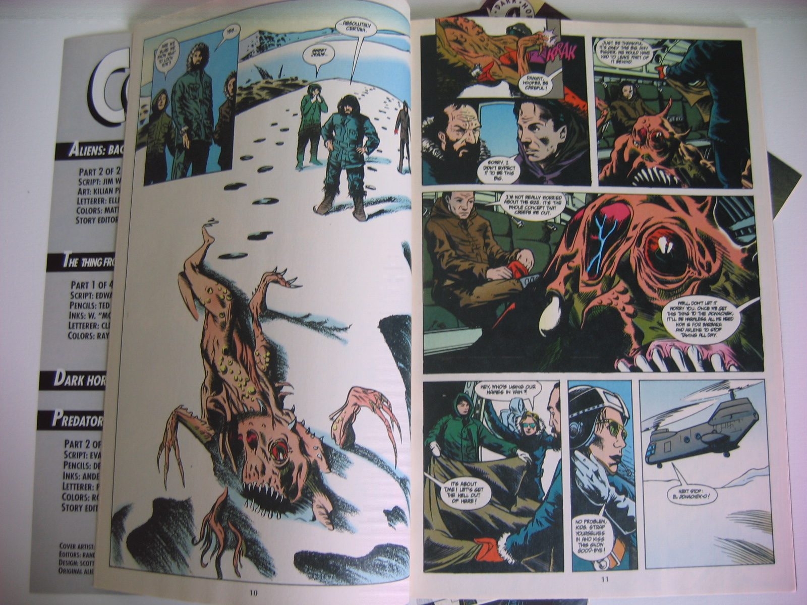 The Thing from Another World foi uma minissérie publicada pela Dark Horse Comics a partir de 1991. Esta editora detém os direitos para a adaptação em HQ’s de outras famosas franquias, como Predator, Aliens e Terminator. O primeiro arco, chamado simplesmente de The Thing from Another World, ocupou duas edições, tendo o seu início diretamente após o final do filme, mostrando os únicos dois sobreviventes do Outpost #31, MacReady e Childs. Escrita por Chuck Pfarrer e ilustrada por John Higgins, esta seqüência quadrinizada seria a mais ideal para uma eventual continuação do clássico de Carpenter: uma trama coesa, que consegue manter o clima de paranóia do filme. E com um trabalho de cores excelente. Algo que me chamou a atenção foi um linha do tempo presente em cada contra-capa, resumindo os principais eventos do filme e do HQ. Outra coisa bacana é a sessão de cartas no final da edição – uma coisa inimaginável hoje em dia.