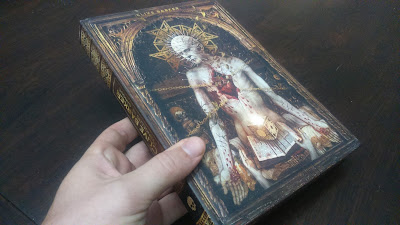 É preciso dedicar um parágrafo ao sensacional formato da edição brasileira de Evangelho de Sangue. Como de costume, a Editora Darkside nos brinda com um volume caprichado contando com capa dura, marcador de página e uma arte de capa simplesmente deslumbrante feita pela Retina 78. Essa capa - e todo projeto gráfico, ficaram incríveis, uma verdadeira obra de arte que vai deixar os colecionadores babando e doidos para tê-la na prateleira. Não estou exagerando! É possivelmente o trabalho mais bonito da Darkside até o momento, o que constitui uma declaração ousada, sobretudo se consideramos a qualidade da maioria de suas publicações. Visualmente, Evangelho é um primor de encher os olhos, as fotos que tirei nem fazem jus à sensação de tê-lo entre as mãos e folheá-lo.