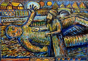 O Kohen andou sete vezes ao redor do corpo, da esquerda para a direita recitando o Zirufim do Fogo. O barro então foi se aquecendo e ficou vermelho, como brasa. Então o Levita deu mais sete voltas ao redor do corpo, da direita para a esquerda, recitando seu Zirufim da Água. O calor arrefeceu a medida que o orvalho aderia ao corpo o esfriando com um assovio. Então, o Rabino Loew andou ao redor do corpo, sete vezes em uma direção, sete vezes na inversa e depositou na boca deste um pergaminho no qual havia escrito o Shem Hameforash, o nome de Deus. Ele se curvou para o leste, para o oeste, sul e norte e então soprou o Zirufim do Ar. Em seguida, os três homens repetiram juntos: "E Ele respirou em sua boca, o sopro da vida; e a criatura ganhou o ânimo para viver".