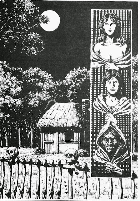 In Call of Cthulhu, Baba Yaga can appear in any forest or grove in Eastern Europe. The position of your hut can vary constantly and disappear, emerging in another location at her will. His dwelling appears as a small wooden hut, surrounded by a low wall and with an inviting open fireplace. She can choose any of her classic manifestations (the young girl or the kind mother) to attract and win the trust of visitors. The darkest form, that of the old sorceress she usually keeps for when the illusion of her house disappears, revealing the horror of her macabre den.