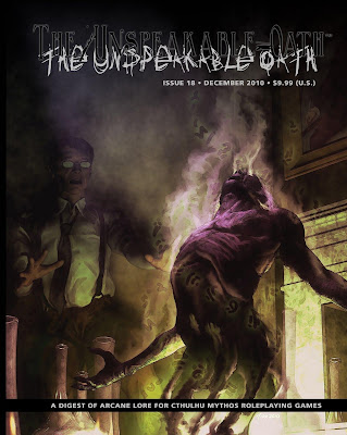 Para quem não sabe ainda, a revista The Unspeakable Oath é uma competente publicação dedicada exclusivamente aos jogos de RPG baseados nos contos de H.P. Lovecraft e a outros assuntos relacionados ao Mythos. Neste ressurgimento, a revista apresenta uma periodicidade quadrimestral; assim em Julho de 2011 foi publicado o exemplar de número 20. Depois de muito tempo, consegui ler e sintetizar o seu conteúdo para esta resenha. Antes tarde do que nunca...
